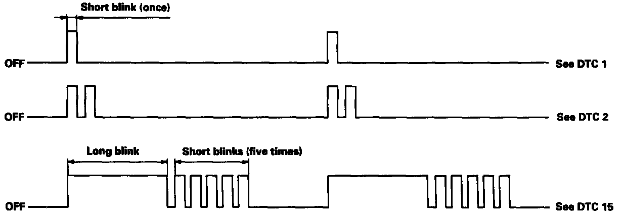 Codes 1 through 9 are indicated by individual short blinks. Codes 10 and above are indicated by a series of long and short blinks. One long blink equals 10 short blinks. Add the long and short blinks together to determine the code. After determining the code, refer to Trouble Code Descriptions. DTC List - Transmission Control Systems