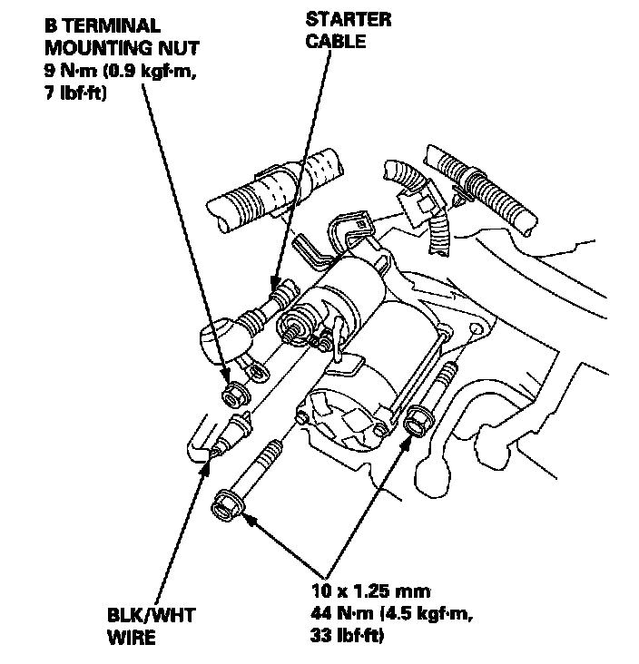 1. Disconnect the battery negative cable.2. Disconnect the starter cable from the B terminal on the solenoid, then disconnect the BLK/WHT wire from the S terminal.