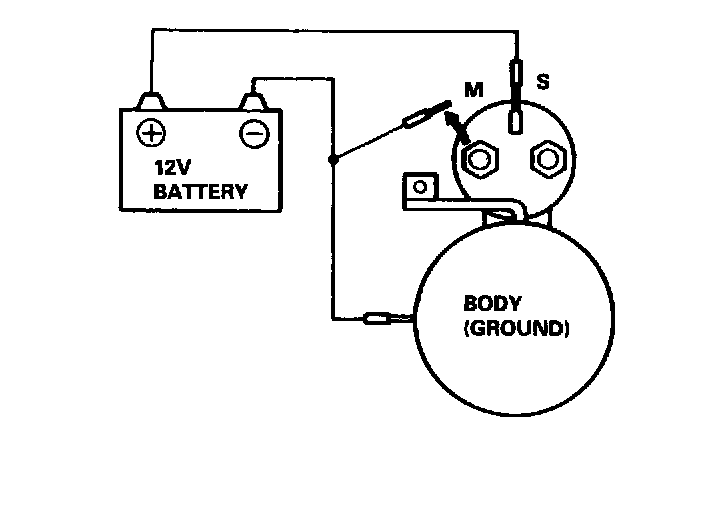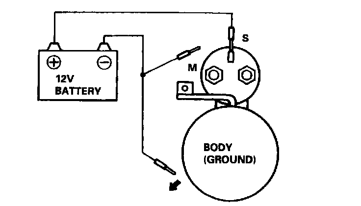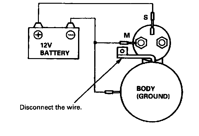 4. Disconnect the battery from the M terminal. If the pinion does not retract, the hold-in coil is working properly. To avoid damaging the starter, do not leave the battery connected for more than 10 seconds.