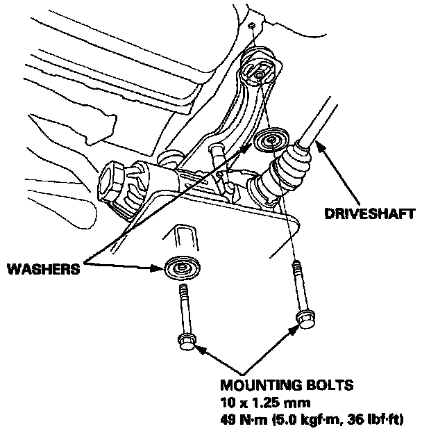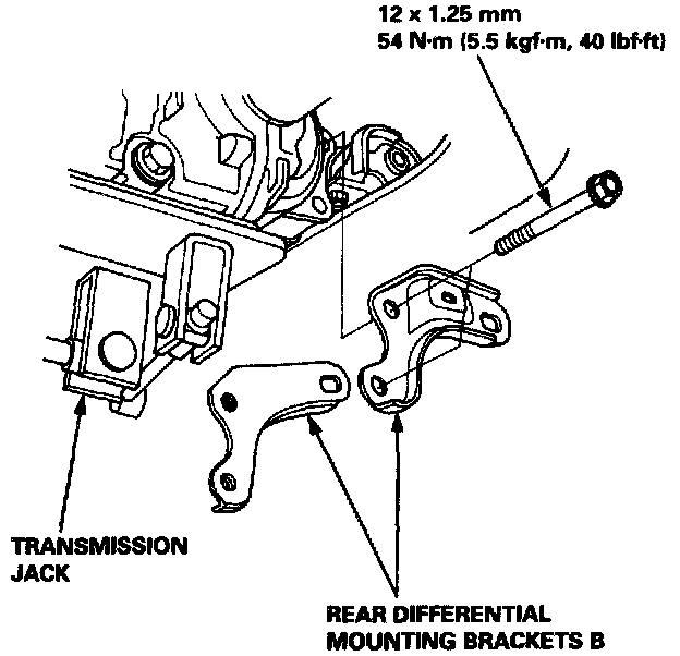 5. Place a transmission jack under the rear differential assembly, then remove the right mounting bracket B and the left mounting bracket B.