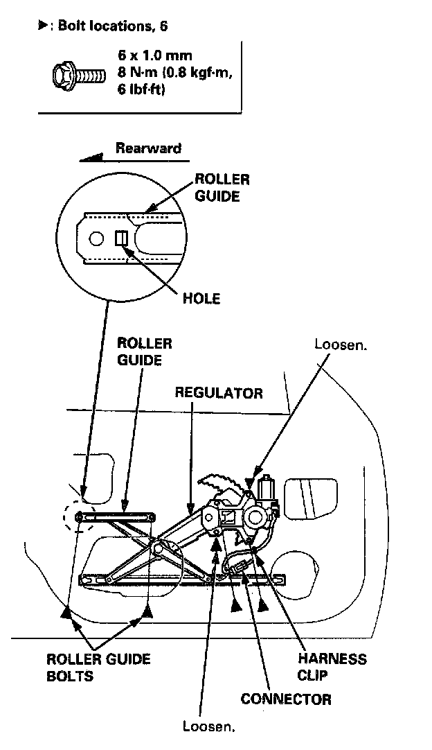 3. Disconnect the connector, and detach the harness clip, then remove the regulator through the hole in the door.
