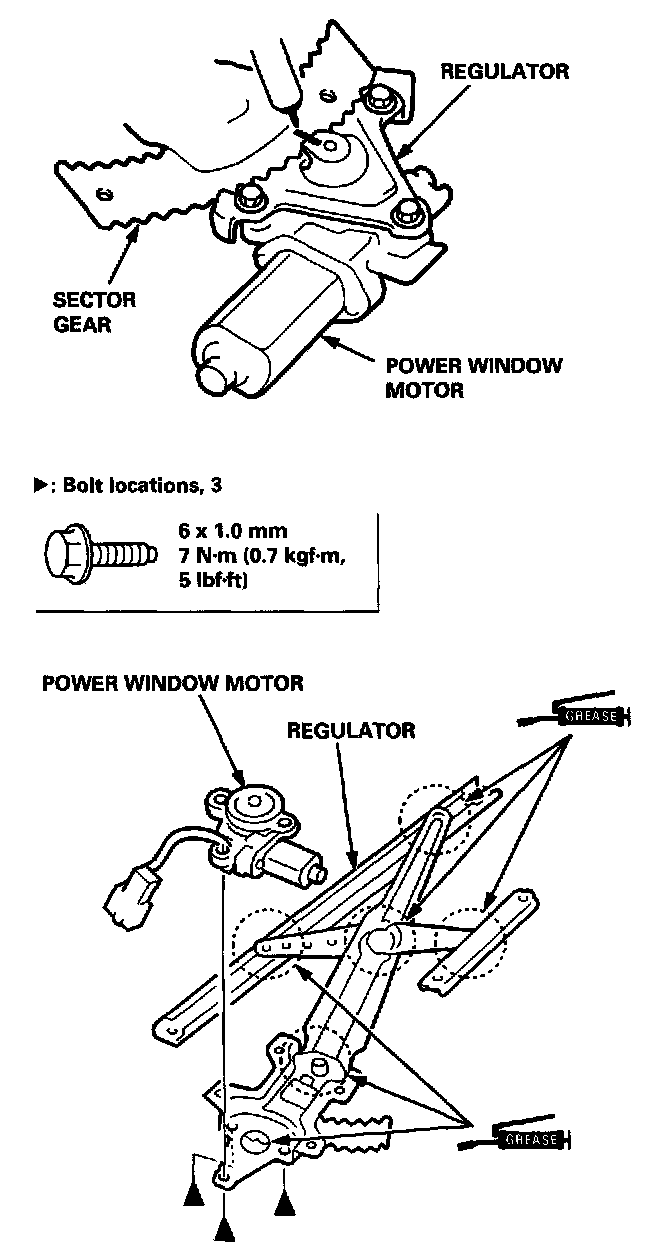 NOTE: If it is necessary to remove the power window motor from the regulator, scribe a line across the sector gear and regulator before you remove the power window motor.