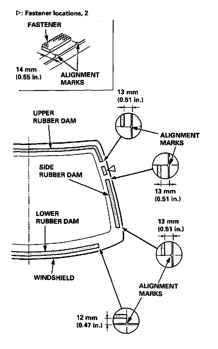10. Glue the rubber dams and fasteners to the inside face of the windshield as shown.