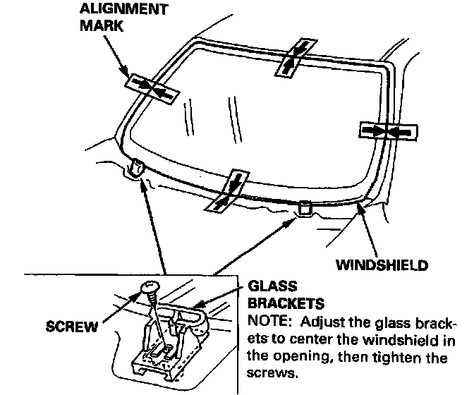 14. Set the windshield on the glass brackets, then center it in the opening. Make alignment marks across the windshield and body with a grease pencil at the four points shown.