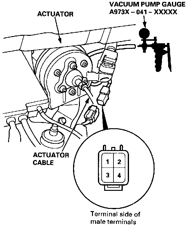 9. Disconnect power and ground from the 4P connector. Disconnect the vent hose from the actuator. Connect a vacuum pump to the actuator vent hose port, and apply vacuum. The actuator rod should pull in completely. If not, the vacuum valve is stuck open. Replace the actuator.