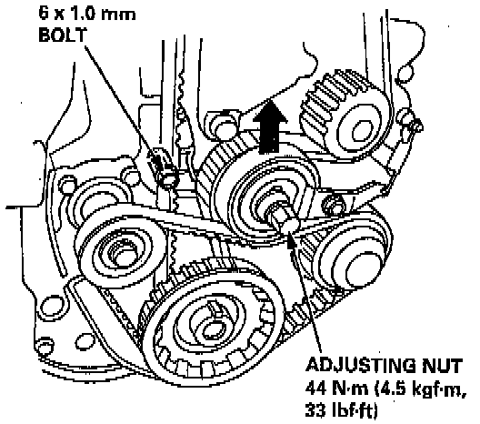 11. Loosen the adjusting nut 2/3 to 1 turn. Push the tensioner to remove tension from the timing balancer belt, then retighten the adjusting nut.