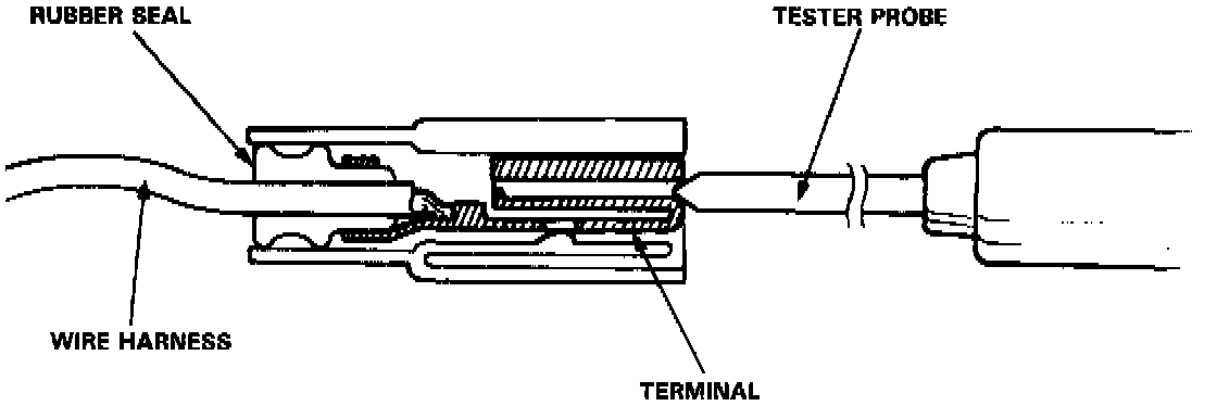 - Bring the tester probe into contact with the terminal from the terminal side of wire harness connectors in the engine compartment. For female connectors, just touch lightly with the tester probe and do not insert the probe.