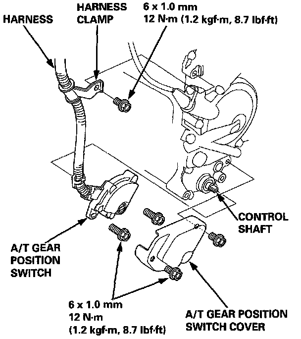 10. Set the control shaft to position, then install the A/T gear position switch on the control shaft.