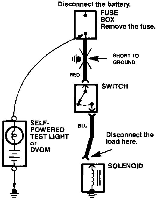 5. If the self-powered test light goes on or the DVOM displays a low reading or no reading (ZERO), there is a short to ground in the wiring near that point.
