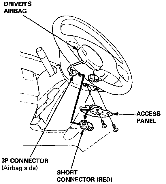 ^ Disconnect the 3P connector between the driver's airbag and cable reel, then connect the short connector (RED) to the airbag side of the connector.