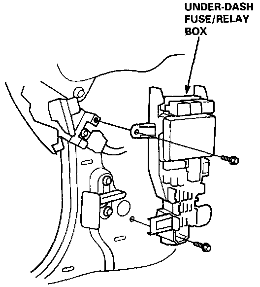 7. Remove the two mounting bolts, and pull the under- dash fuse/relay box away from the left kick panel.