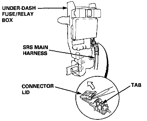 CAUTION: Avoid breaking the SRS main harness connector; it's double-locked.