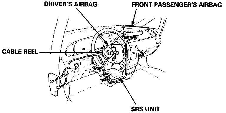 The SRS is a safety device which, when used in conjunction with the seat belt, is designed to help protect the driver and front passenger in a frontal impact exceeding a certain set limit. The system consists of the SRS unit (including safing sensor and impact sensor), the cable reel, the driver's airbag, and front passenger's airbag.