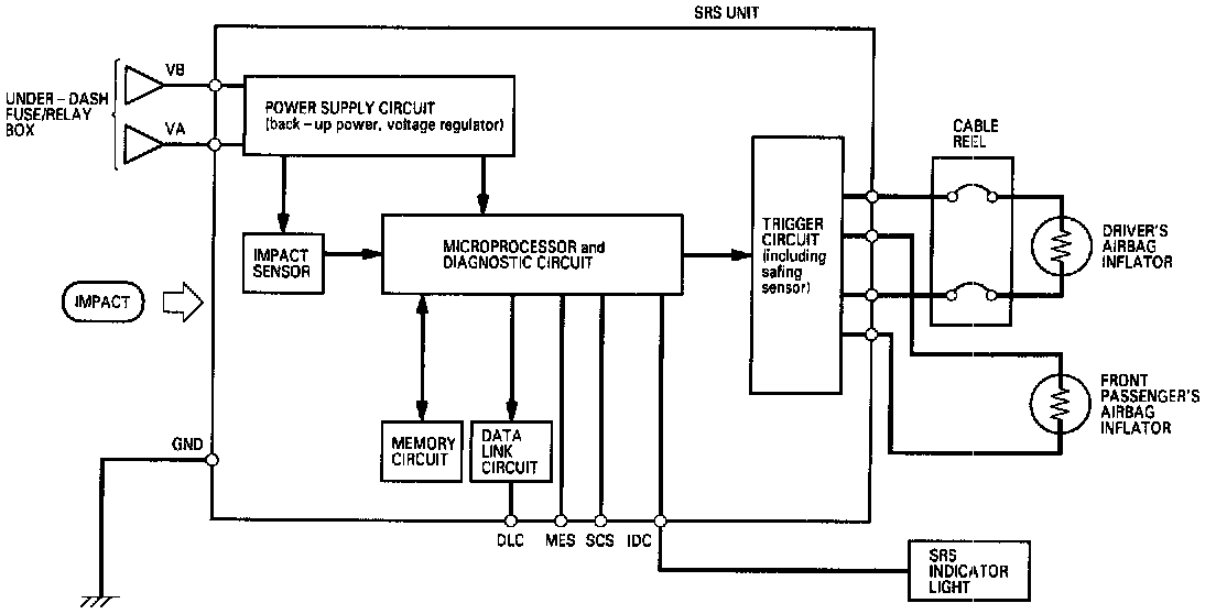 The main circuit in the SRS unit senses and judges the force of impact and, if necessary, ignites the inflator charges. If battery voltage is too low or power is disconnected due to the impact, the back-up power circuit will keep voltage at a constant level.