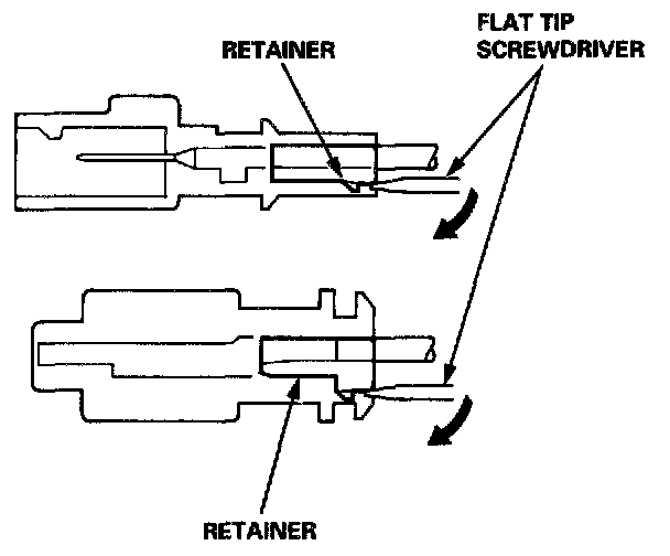 When checking voltage or resistance on this type of connector the first time, you must remove the retainer to insert the tester probe from the wire side.NOTE: It is not necessary to reinstall the removed retainer; the terminals will stay locked in the connector housing.