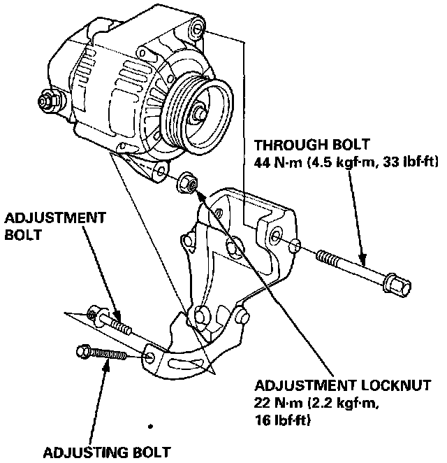 2. Turn the adjusting bolt to obtain the proper belt tension, then retighten the nut and through bolt.