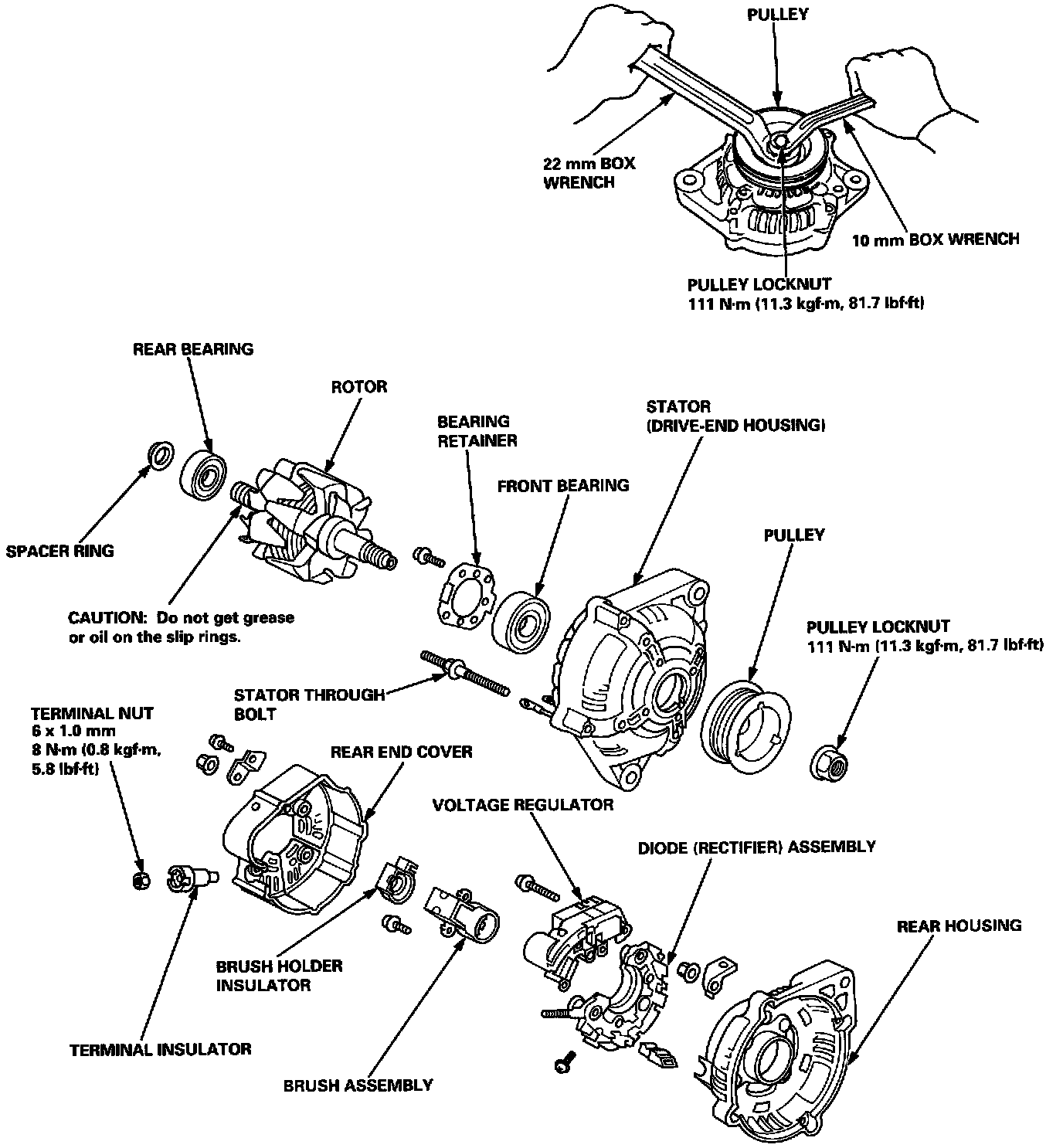 NOTE: It is not necessary to separate the pulley, drive end housing, and the rotor unless the front bearing needs replacement.