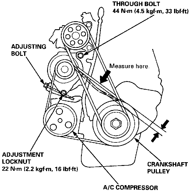 Apply a force of 98 N (10 kgf, 22 lbf), and measure the deflection between the alternator and the crankshaft pulley.