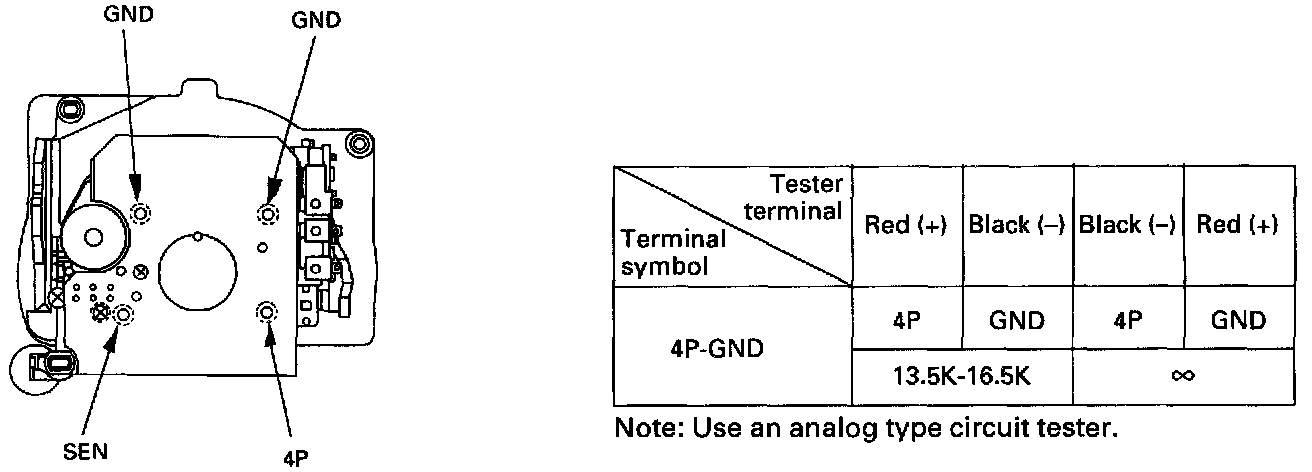 Remove the speedometer from the meter assembly, and measure the resistance value between the terminals. Replace the speedometer assembly when the result of inspection is found abnormal.