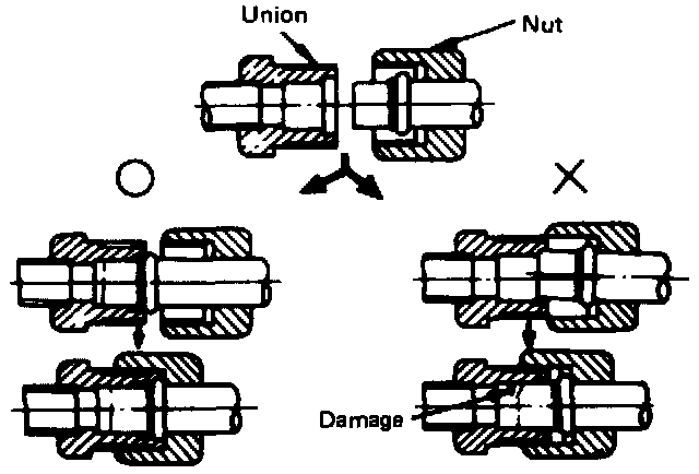 Insert nut into union. First tighten nut by hand as mush as possible. Then, tighten nut to specified torque.