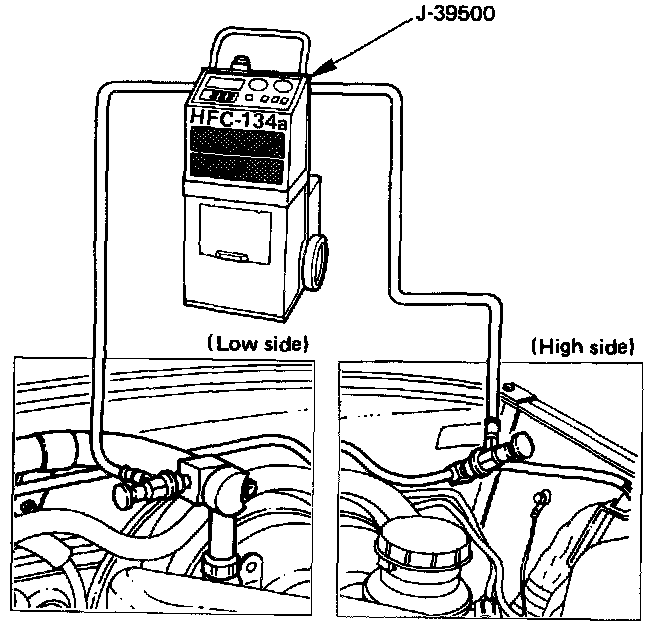 The refrigerant must be discharged and recovered by using the J-39500 (ACR4: HFC-134a Refrigerant Recovery/Recycling/Recharging/System) or equivalent before removing or mounting air conditioning parts.1. Connect the high and low charging hoses of the ACR4 (or equivalent) as shown.
