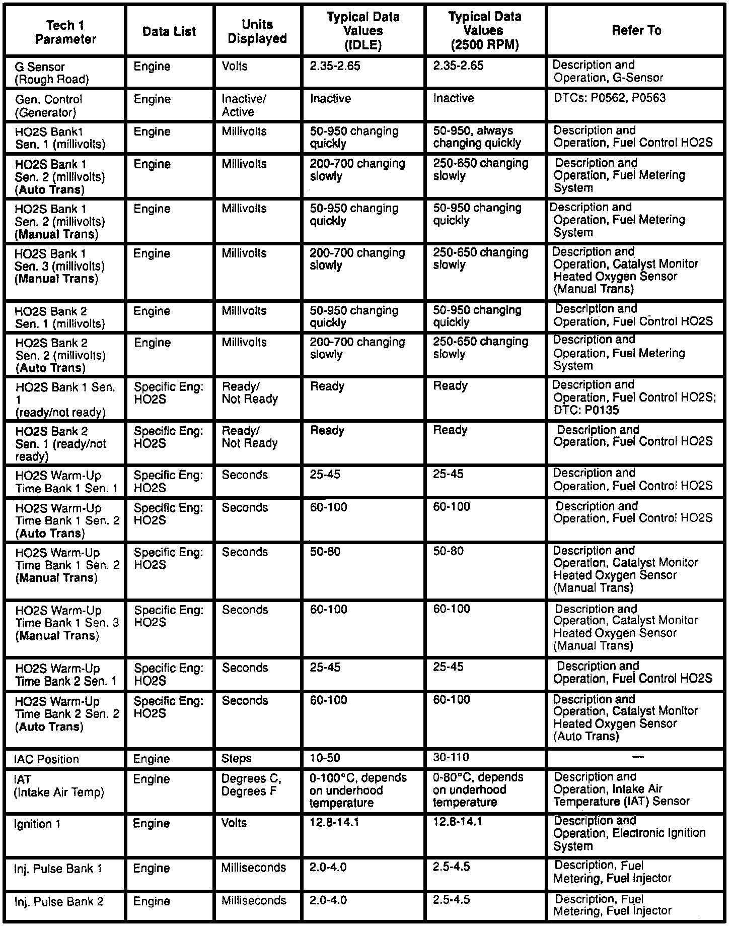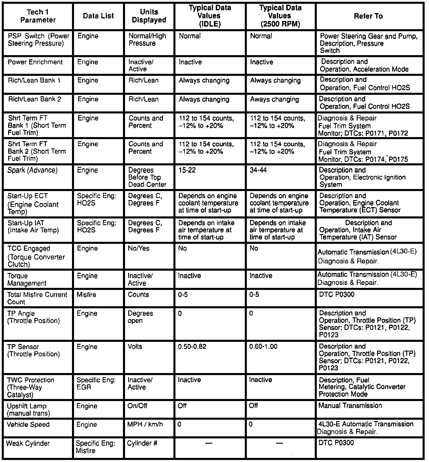 Use the Typical Scan Data Values Table only after the On-Board Diagnostic System Check has been completed, no DTC(s) were noted, and you have determined that the on-board diagnostics are functioning properly. Scan tool values from a properly-running Engine may be used for comparison with the Engine you are diagnosing. The typical scan data values represent values that would be seen on a normally-running Engine.