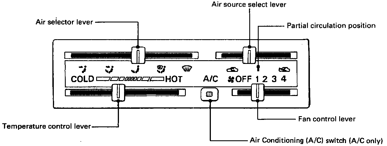 Placing the lever in an intermediate position will cause a lesser or greater amount of air to reach the heater core. In this mode the passenger compartment temperature can be regulated.