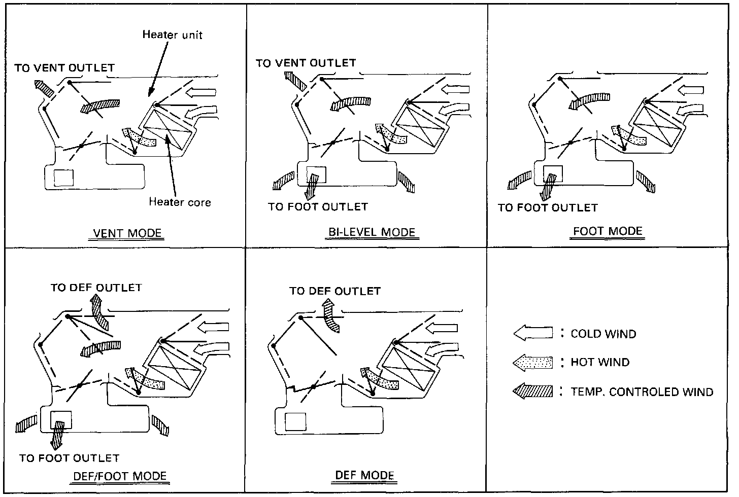 The vehicle has been cable-control-type to control by cable the mode and temperature of the heater unit and the mode door for the air source of the blower assembly.