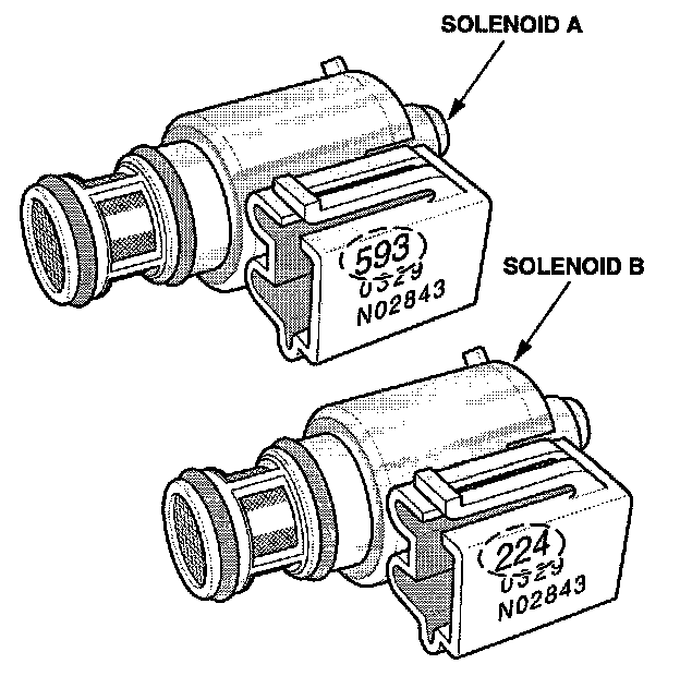 When installing these solenoids in the valve body, make sure you don't get them mixed up or install them in the wrong position. It's easy to do since these solenoids look almost identical. Fortunately, each solenoid has some of its part number engraved on its connector. Solenoid A has 593; solenoid B has 224.
