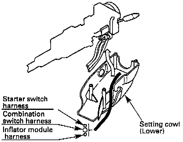 6. Steering column cover. When installing the steering column cover, be sure to wire (through each harness) as illustrated so that the harnesses starter switch, combination switch and SRS coil may not catch wiring.