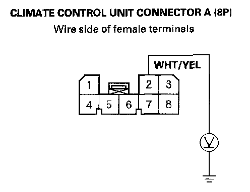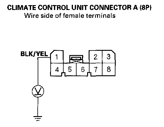 4. Measure the voltage between the No.1 terminal of climate control unit connector A (8P) and body ground.