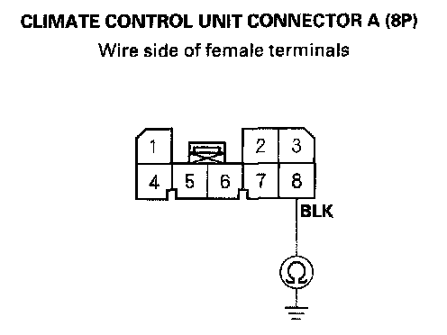 7. Check for continuity between the No.8 terminal of climate control unit connector A (8P) and body ground.