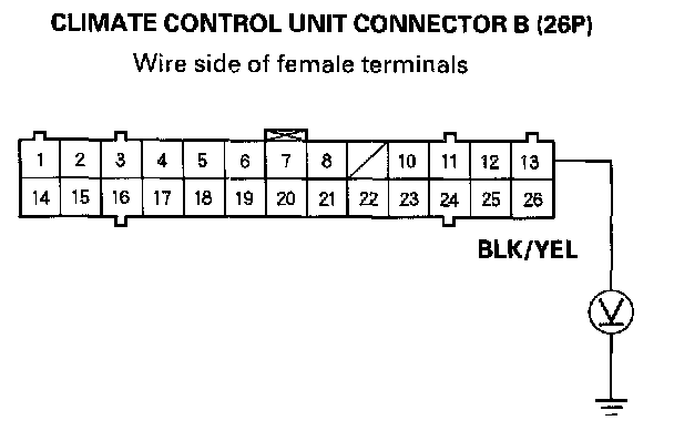 10. Measure the voltage between the No.13 terminal of climate control unit connector B (26P) and body ground