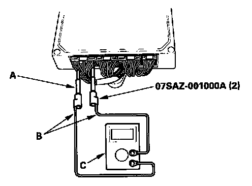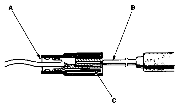 3. If you cannot get to the wire side of the connector or the wire side is sealed (A), disconnect the connector and use the tester probe (B) to probe the connectors (C) from the terminal side. Do not force the probe into the connector.