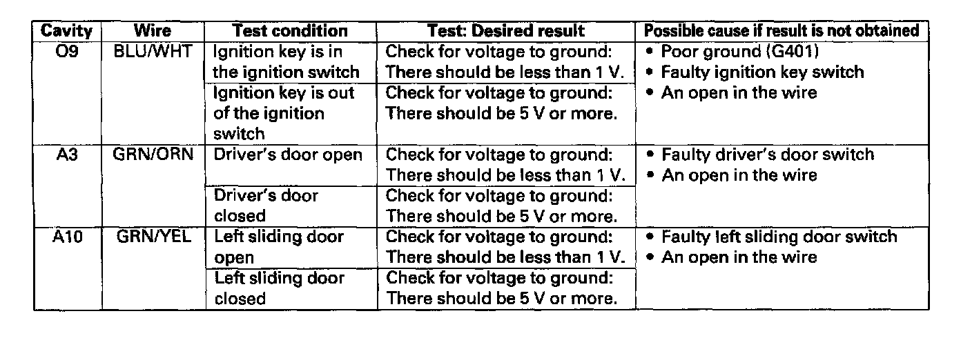 13. Reconnect the connector to the door unit, and perform the following input tests at the connectors.