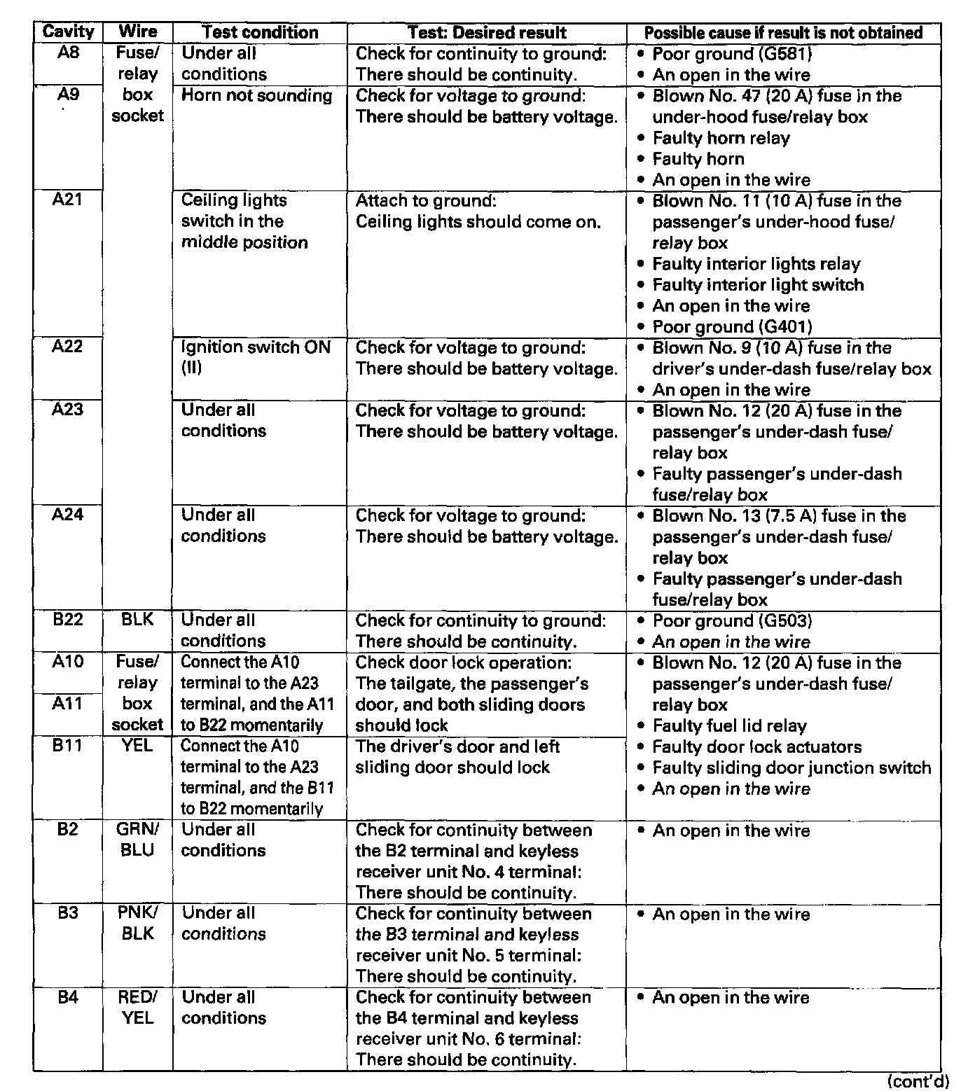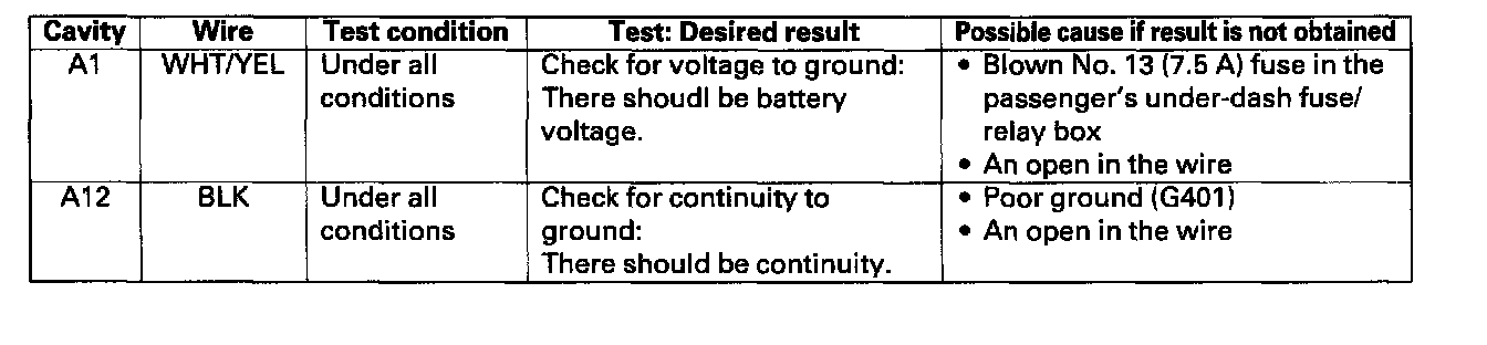 4. With the driver's unit still disconnected, make these input tests at the connector and fuse/relay box sockets.