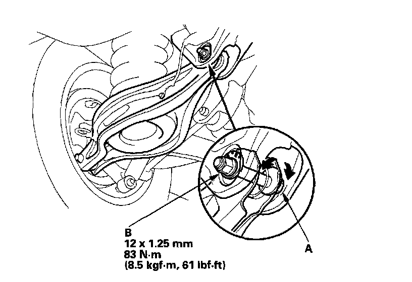 3. Hold the adjusting bolt (A) on the rear lower arm B, and loosen the self-locking nut (B).