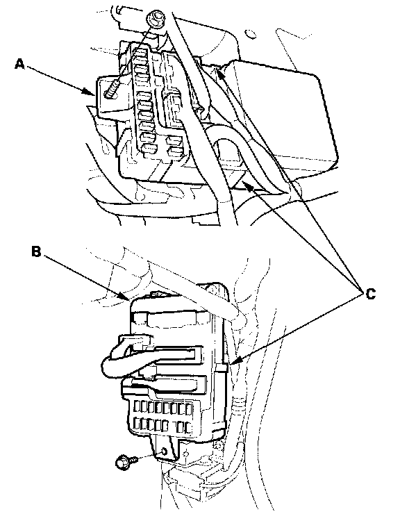 6. Remove the mounting bolt release the clips (C) at the middle on both sides of the box, and pull the fuse/relay box away from the body.