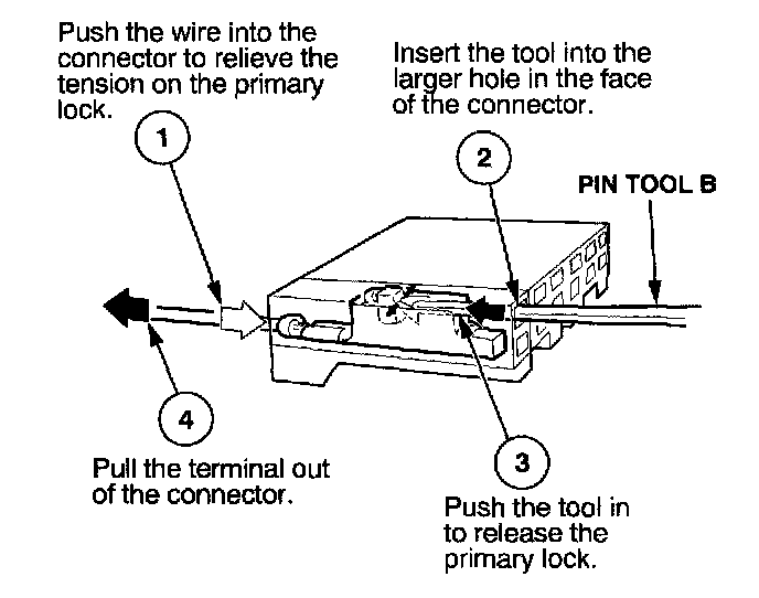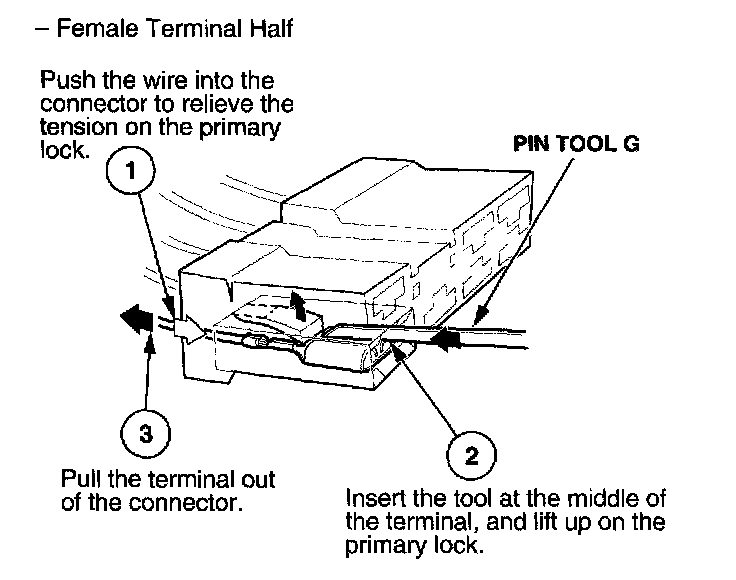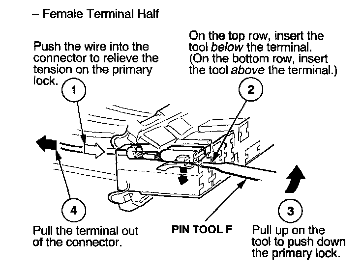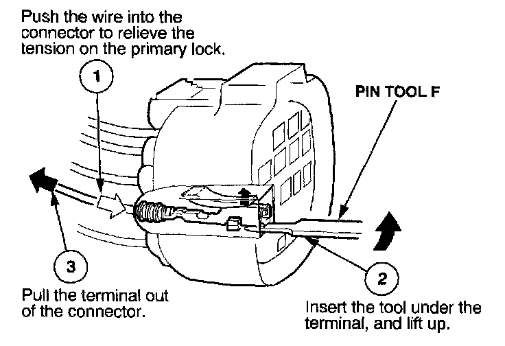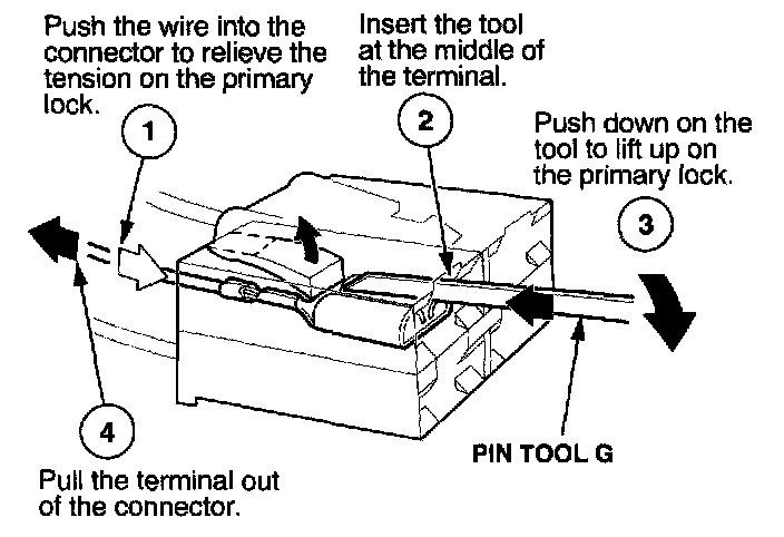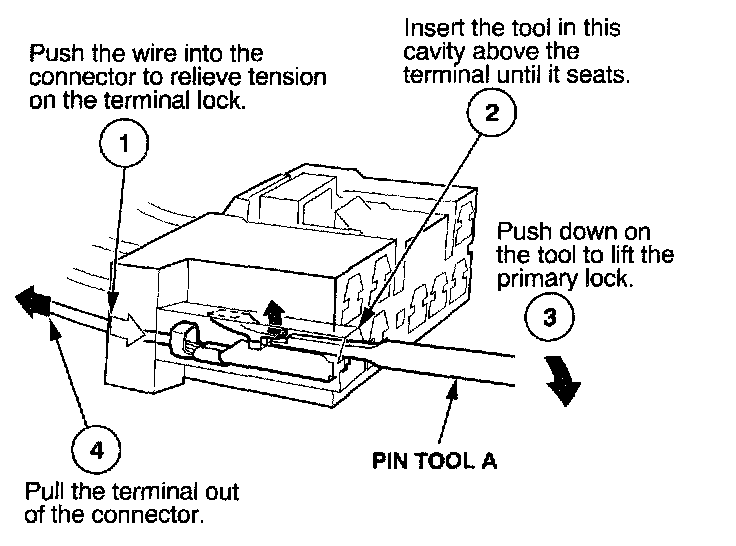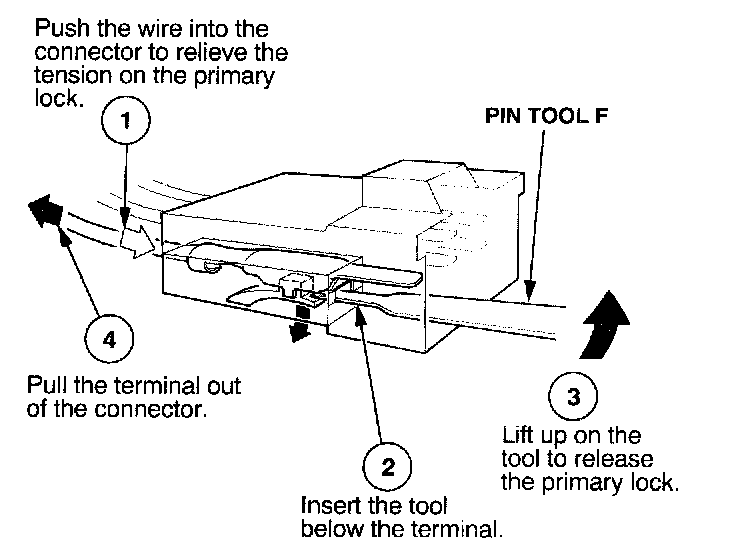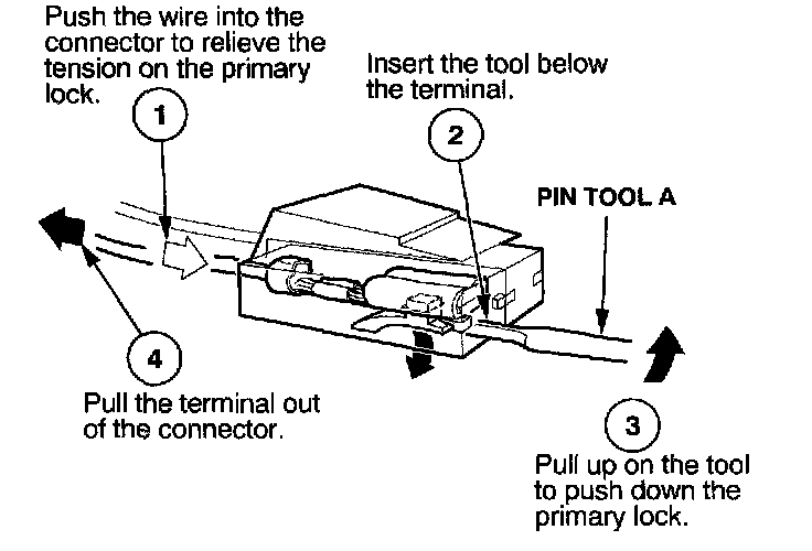 Before you begin, inspect the wire you are about to repair for damage and length. Make sure the wire will be long enough to make a terminal repair without stretching it when you reinstall the terminal in the connector. If the wire is too short, or if access to the connector is too restricted to make a terminal repair, you may need to install a pigtail terminal (a short length of wire with a factory-crimped terminal on it). Refer to HOW TO INSTALL PIGTAIL TERMINALS.