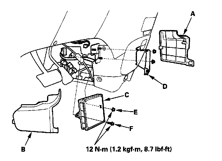 4. Remove the PCM mounting bolt (F) and remove the PCM.