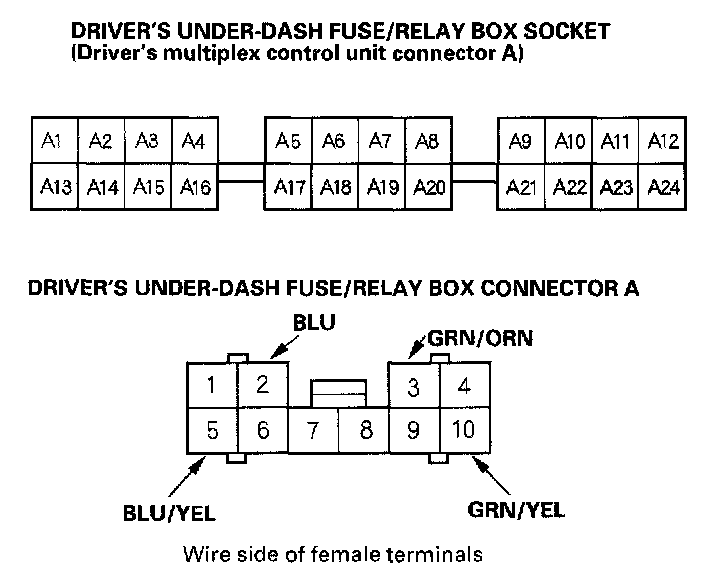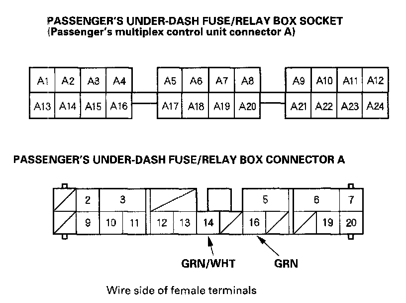 8. With the passenger's multiplex control unit still disconnected, make these input tests at the connector and fuse/relay box socket.