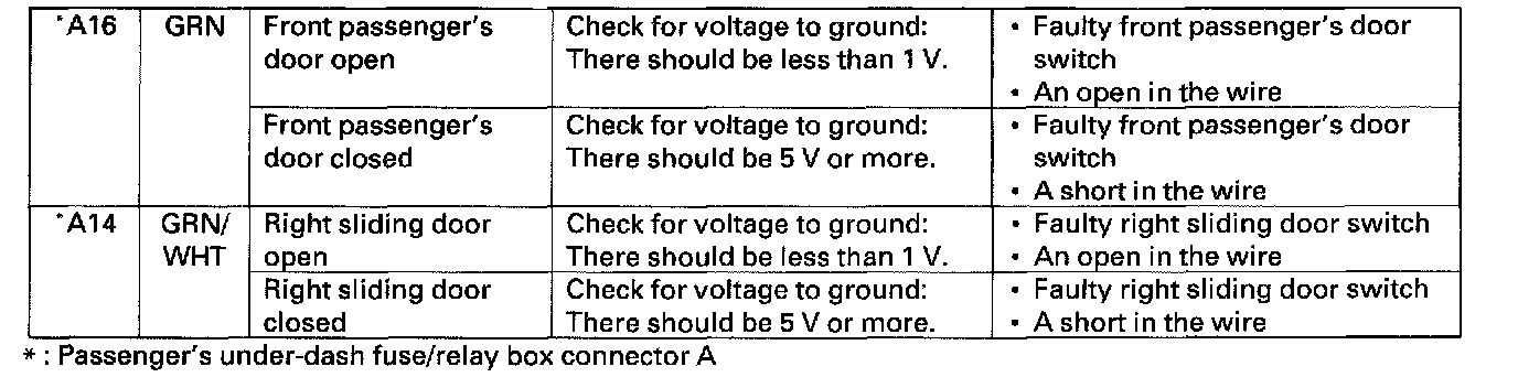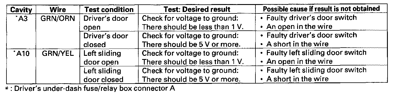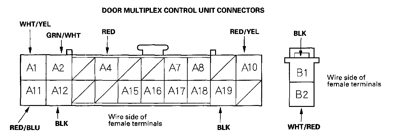 12. With the door multiplex control unit still disconnected, make these input tests at the connectors.