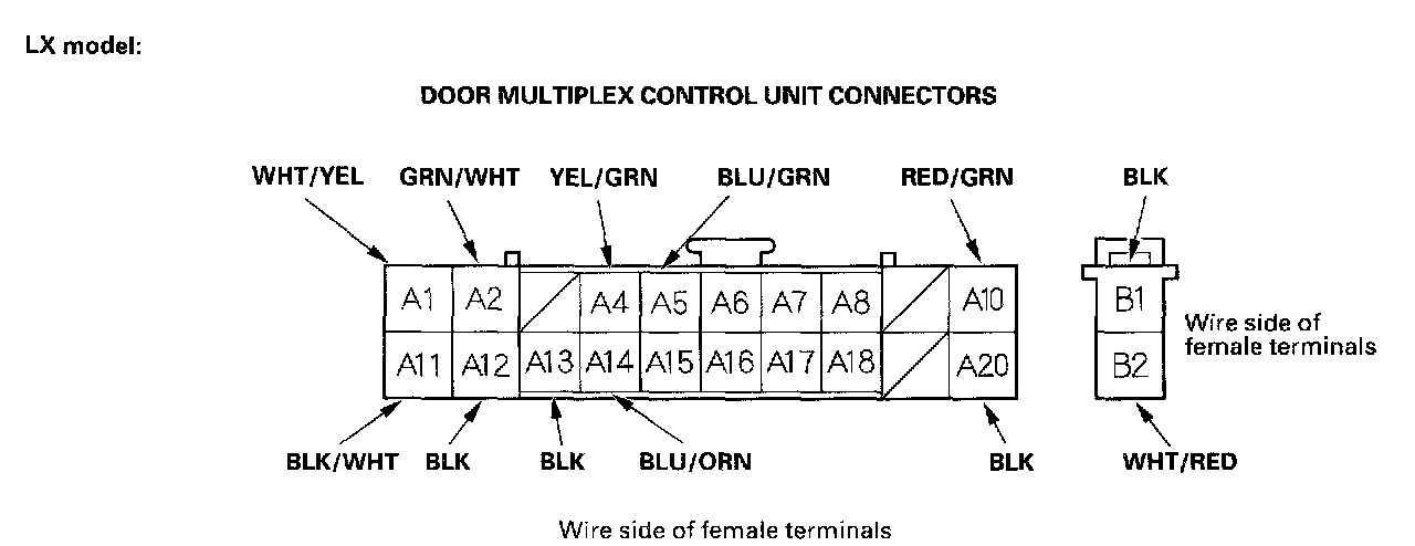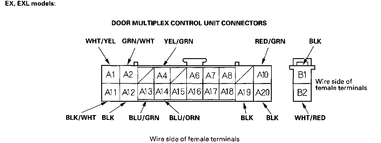 NOTE: For the terminals A4, A5 (LX), A10 A11, A13 (EX,EXL), and AU, refer to the power window control unit input test.