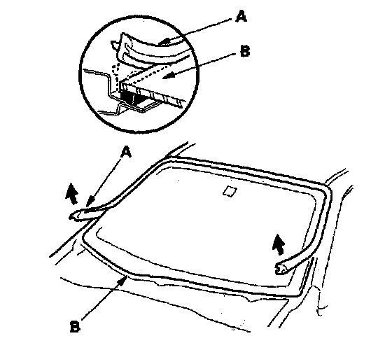 2. Remove the molding (A) from the edge of the windshield (B). If necessary, cut the molding with a utility knife.