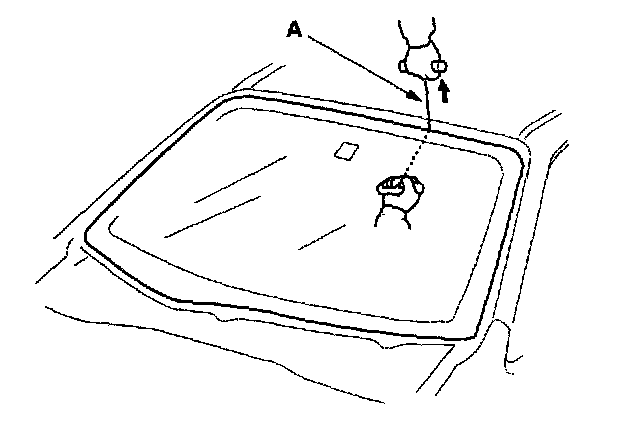 6. With a helper on the outside, pull the piano wire (A) back and forth in a sawing motion. Hold the piano wire as close to the windshield as possible to prevent damage to the body and dashboard. Carefully cut through the rubber dam and adhesive around the entire windshield.
