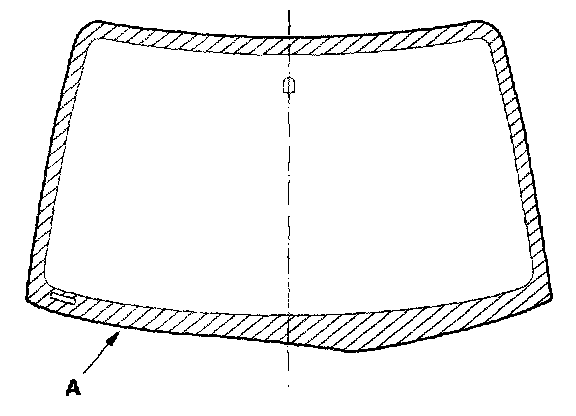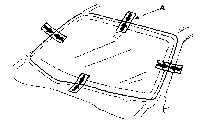 16. Set the windshield in the opening, and center it. Make alignment marks (A) across the windshield and body with a grease pencil at the four points shown. Be careful not to touch the windshield where adhesive will be applied.