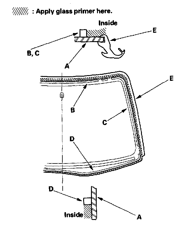 18. With a sponge, apply a light coat of glass primer around the edge of the windshield (A) between the upper rubber dam (B), side rubber dam (C), lower rubber dam (D) and molding (E) as shown, then lightly wipe it off with gauze or cheesecloth: