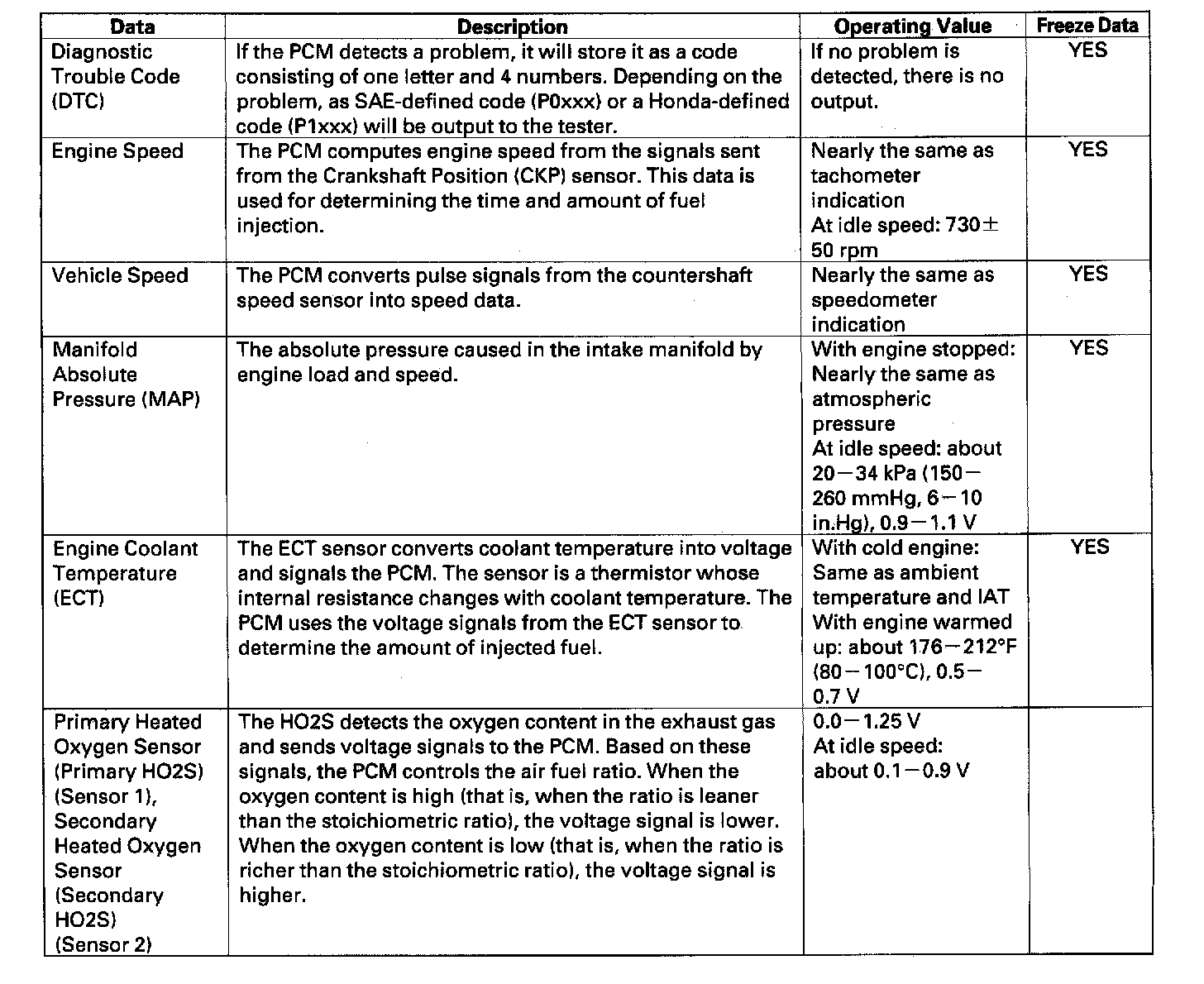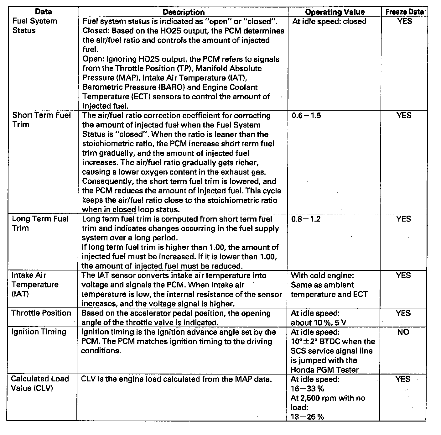 You can retrieve data from the PCM by connecting the OBD II scan tool or the Honda PGM Tester to the Data Link Connector (DLC). The items listed in the table below conform to SAE recommended practice. The Honda PGM Tester also reads data beyond that recommended by SAE. Understanding this data may help you find the causes of intermittent problems.