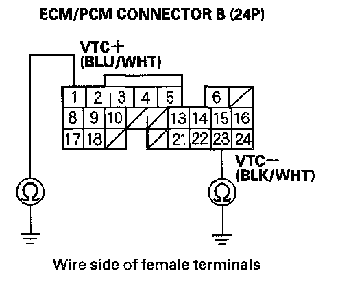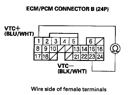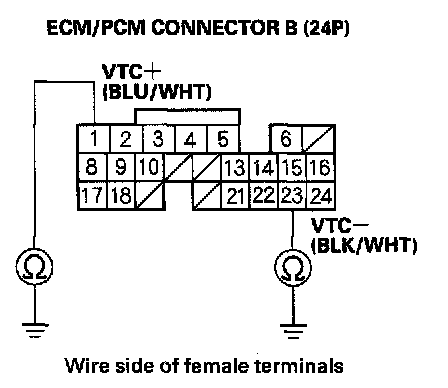 6. Measure resistance between ECM/PCM connector terminal B1 and B23.