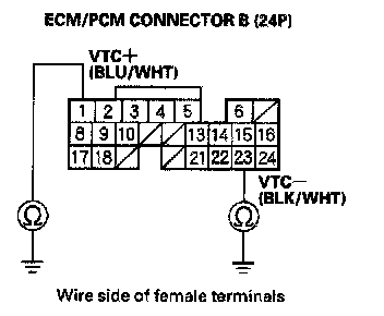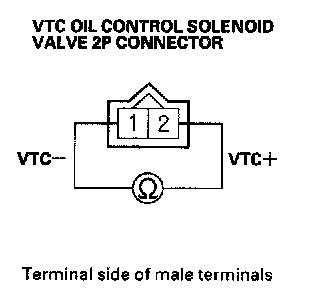 8. Measure resistance between VTC oil control solenoid valve 2P terminal No. 1 and No. 2.